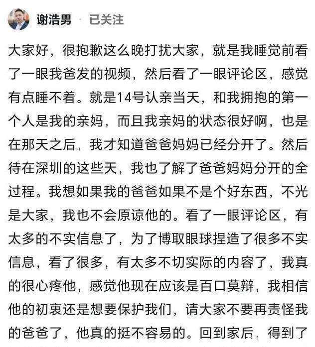 谢浩男能站出来力挺老爸,说明他心里还是爱着这个家的。
